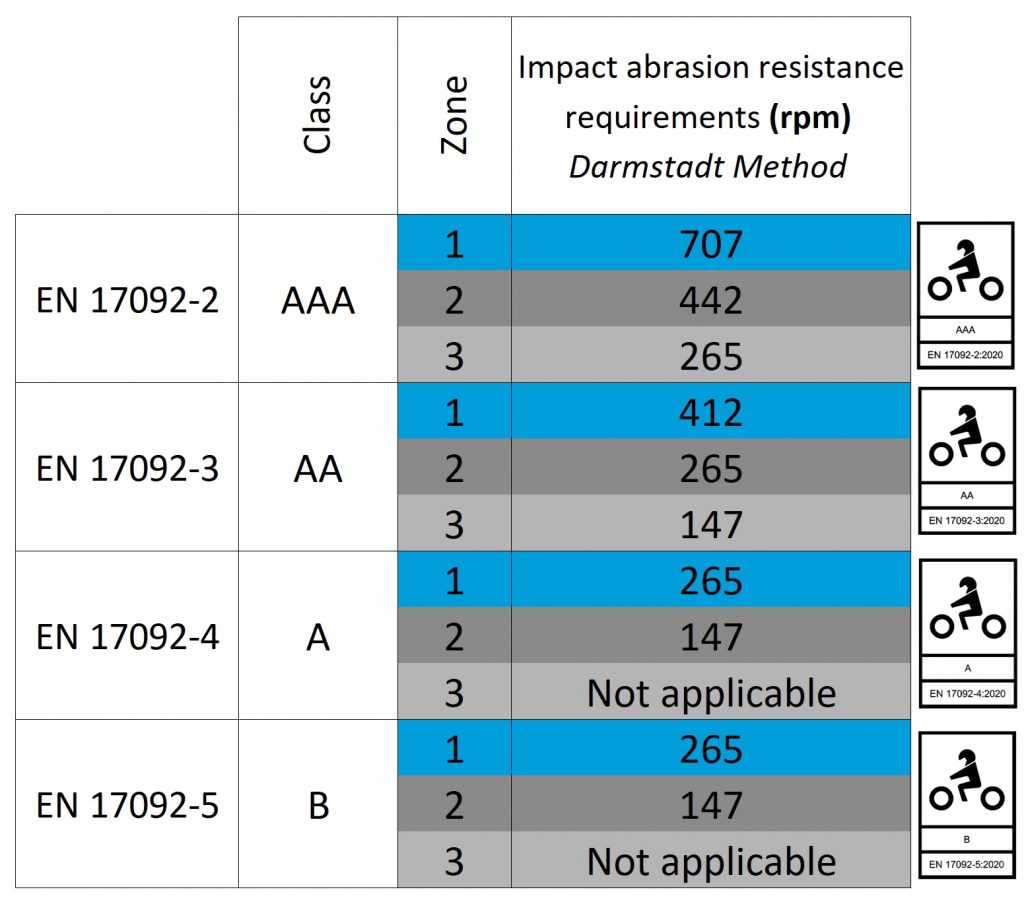 EN 17092-1: 2020 is part of the current series of standards EN 17092: 2020 and describes corresponding definitions and test methods with regard to ergonomics, zone classification, mechanical properties and impact abrasion resistance for the examination and classification of the requirements for motorcycle protective clothing in EN 17092-2 to EN 17092-6 .